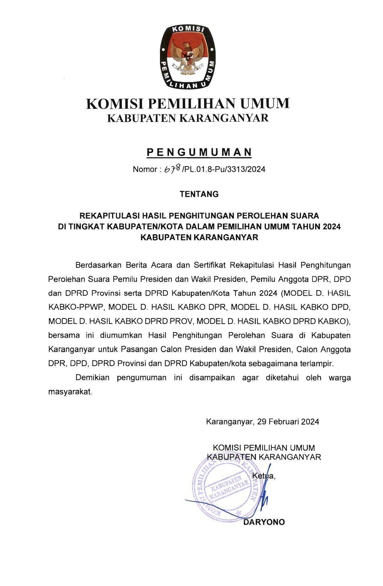 PENGUMUMAN REKAPITULASI HASIL PENGHITUNGAN PEROLEHAN SUARA DI TINGKAT KABUPATEN/ KOTA DALAM PEMILIHAN UMUM TAHUN 2024 KABUPATEN KARANGANYAR