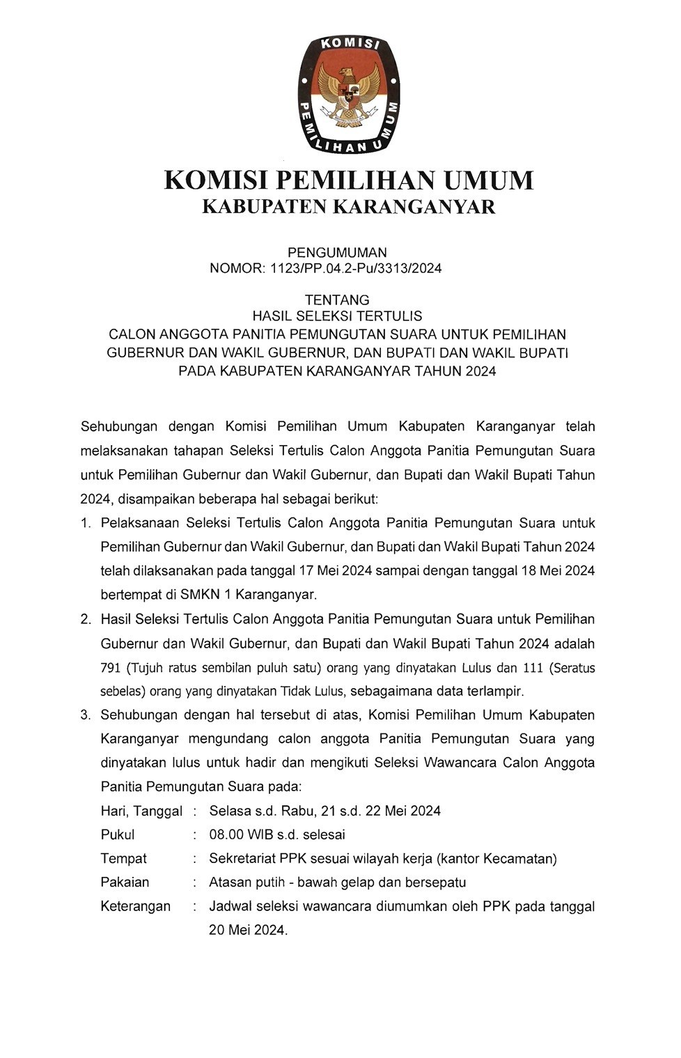 Pengumuman Hasil Seleksi Tertulis Calon Anggota Badan Adhoc PPK Selengkapnya