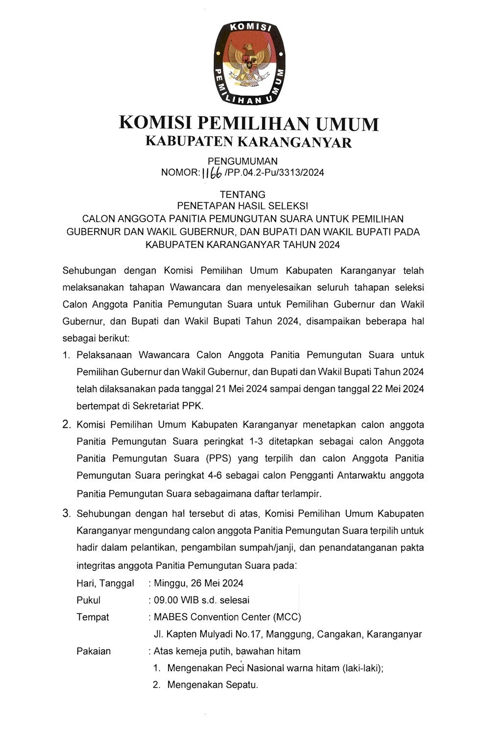 Pengumuman Penetapan Hasil Seleksi Calon Anggota PPS untuk Pilkada Serentak 2024 Selengkapnya