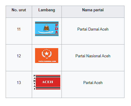 Peserta pemilihan umum anggota DPRD adalah partai politik yang sama dengan peserta pemilihan umum anggota DPR, kecuali khusus untuk Provinsi Aceh ditambah dengan partai politik lokal sesuai dengan Undang-Undang Pemerintahan Aceh dan Nota Kesepahaman Helsinki 2005. Berikut adalah daftar 3 partai politik lokal yang ditetapkan oleh Komite Independen Pemilihan Aceh sebagai peserta pemilihan umum anggota DPRD di Aceh beserta nomor urutnya.