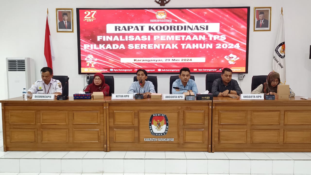 KPU Karanganyar selenggarakan Rapat Koordinasi Finalisasi Pemetaan Tempat Pemungutan Suara (TPS) untuk Pilkada Serentak Tahun 2024 di Aula Kantor KPU Karanganyar pada Rabu, 29 Mei 2024.