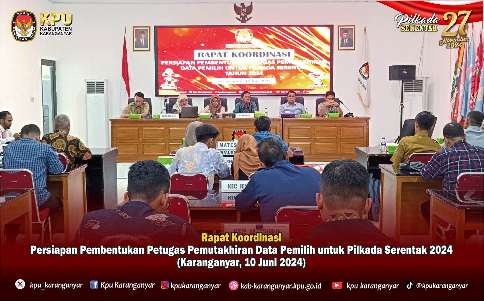 KPU Kabupaten Karanganyar menyelenggarakan Rapat Koordinasi Persiapan Pembentukan Petugas Pemutakhiran Data Pemilih untuk Pilkada Serentak Tahun 2024 di Aula Kantor KPU Karanganyar pada Senin (10/06/2024).
