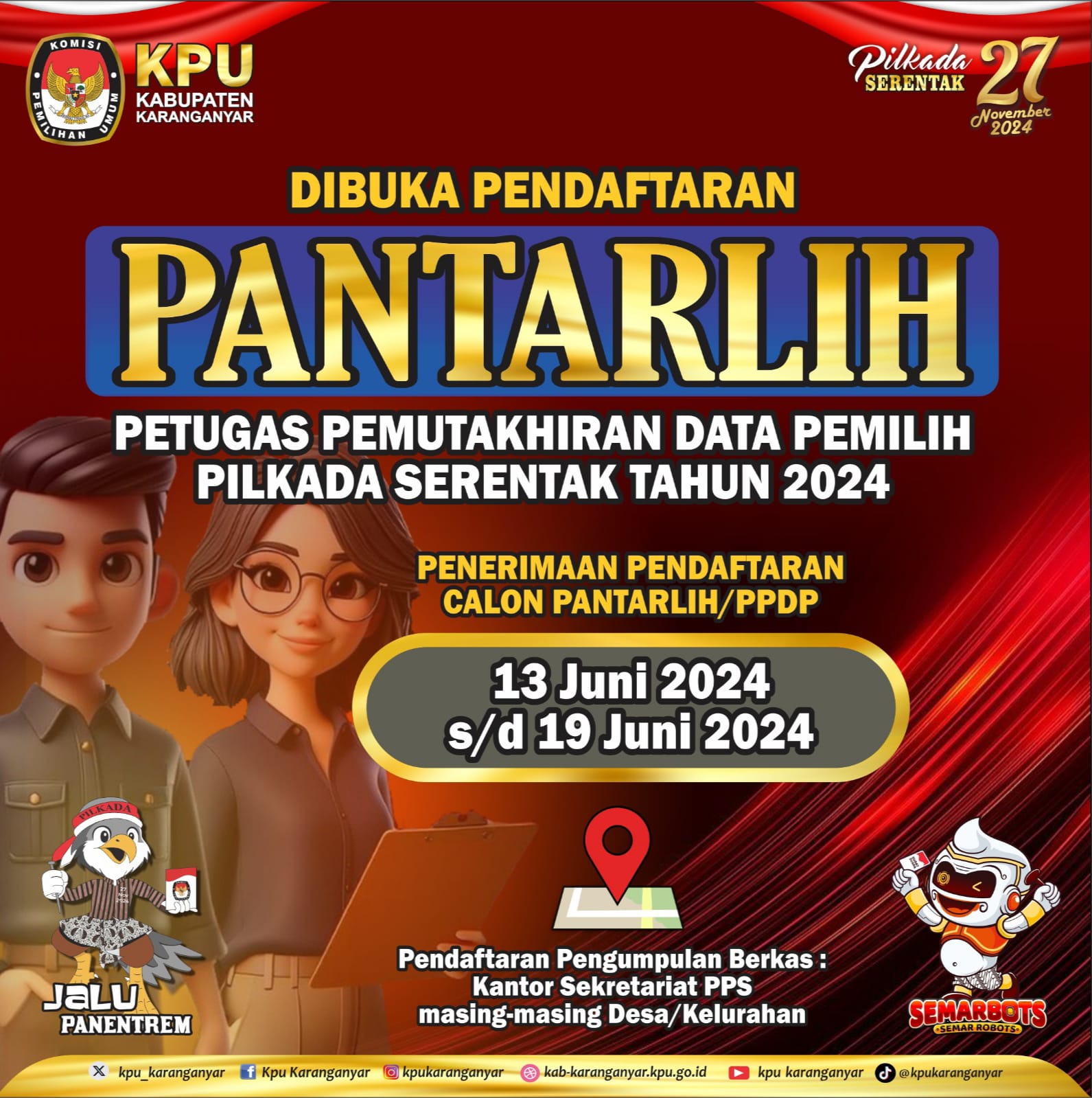 Dibuka Pendaftaran Pantarlih (Petugas Pemutakhiran Data Pemilih) untuk Pilkada Serentak Tahun 2024. Penerimaan pendaftaran calon Pantarlih/PPDP dimulai tanggal 13 Juni s/d 19 Juni 2024. Pendaftaran dan Pengumpulan Berkas di Kantor Sekretariat PPS masing-masing Desa/Kelurahan.