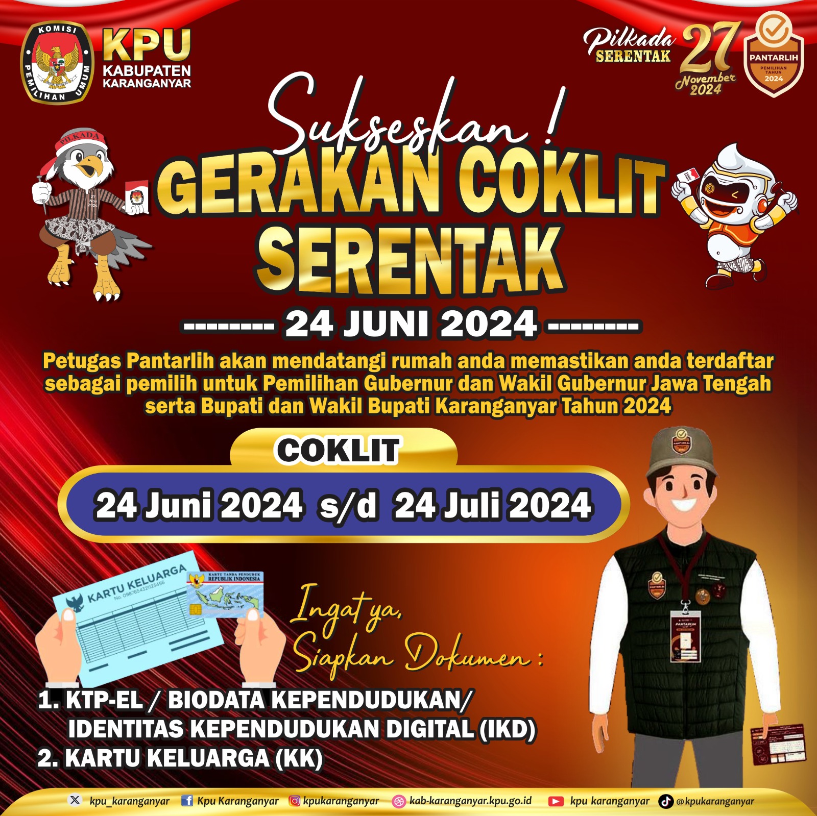 Sukseskan Gerakan Coklit Serentak 24 Juni 2024. Petugas Pantarlih akan mendatangi rumah anda untuk memastikan anda terdaftar sebagai pemilih untuk Pilkada Serentak tahun 2024 mendatang. Coklit dilaksanakan mulai tanggal 24 Juni sampai dengan 24 Juli 2024.