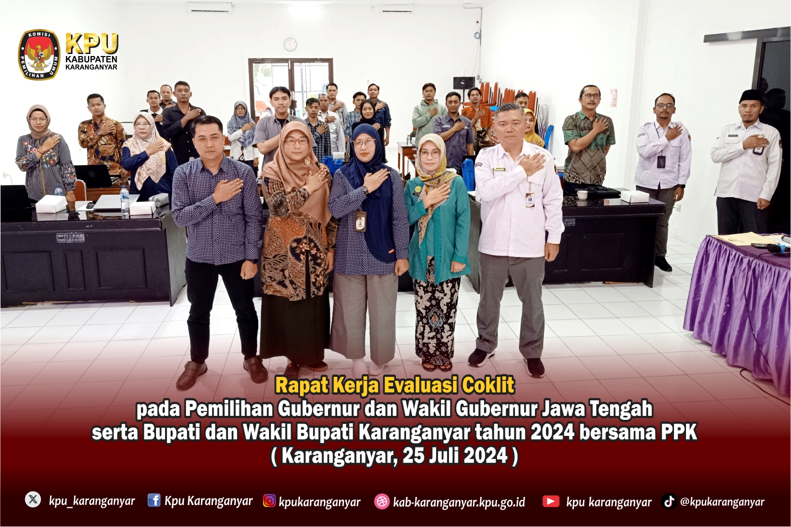 Kamis, 25 Juli 2024, KPU Kabupaten Karanganyar menyelenggarakan kegiatan Rapat Kerja Evaluasi Coklit pada Pemilihan Gubernur dan Wakil Gubernur Jawa Tengah serta Bupati dan Wakil Bupati Karanganyar tahun 2024 bersama PPK bertempat di Aula KPU.