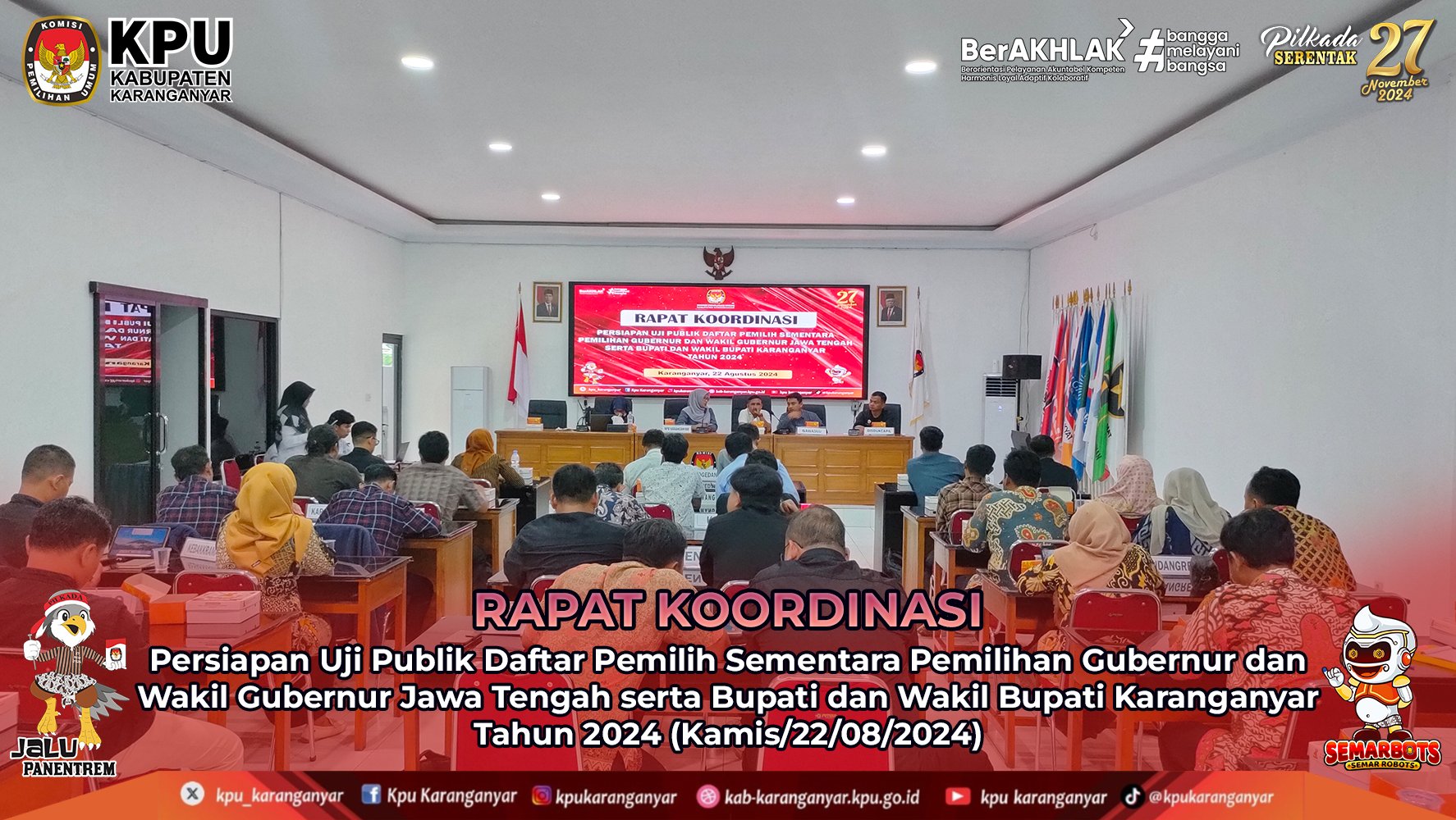 KPU Karanganyar selenggarakan Rapat Koordinasi Persiapan Uji Publik Daftar Pemilih Sementara Pemilihan Gubernur dan Wakil Gubernur Jawa Tengah serta Bupati dan Wakil Bupati Karanganyar Tahun 2024 di aula Kantor KPU Kabupaten Karanganyar, (Kamis, 22 Agustus 2024)