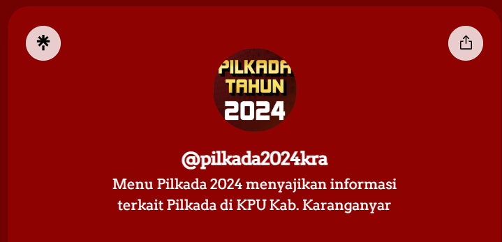 Untuk mengakses informasi mengenai Pilkada Tahun 2024 di Kabupaten Karanganyar dapat mengeklik link Sidatan di bawah ini :