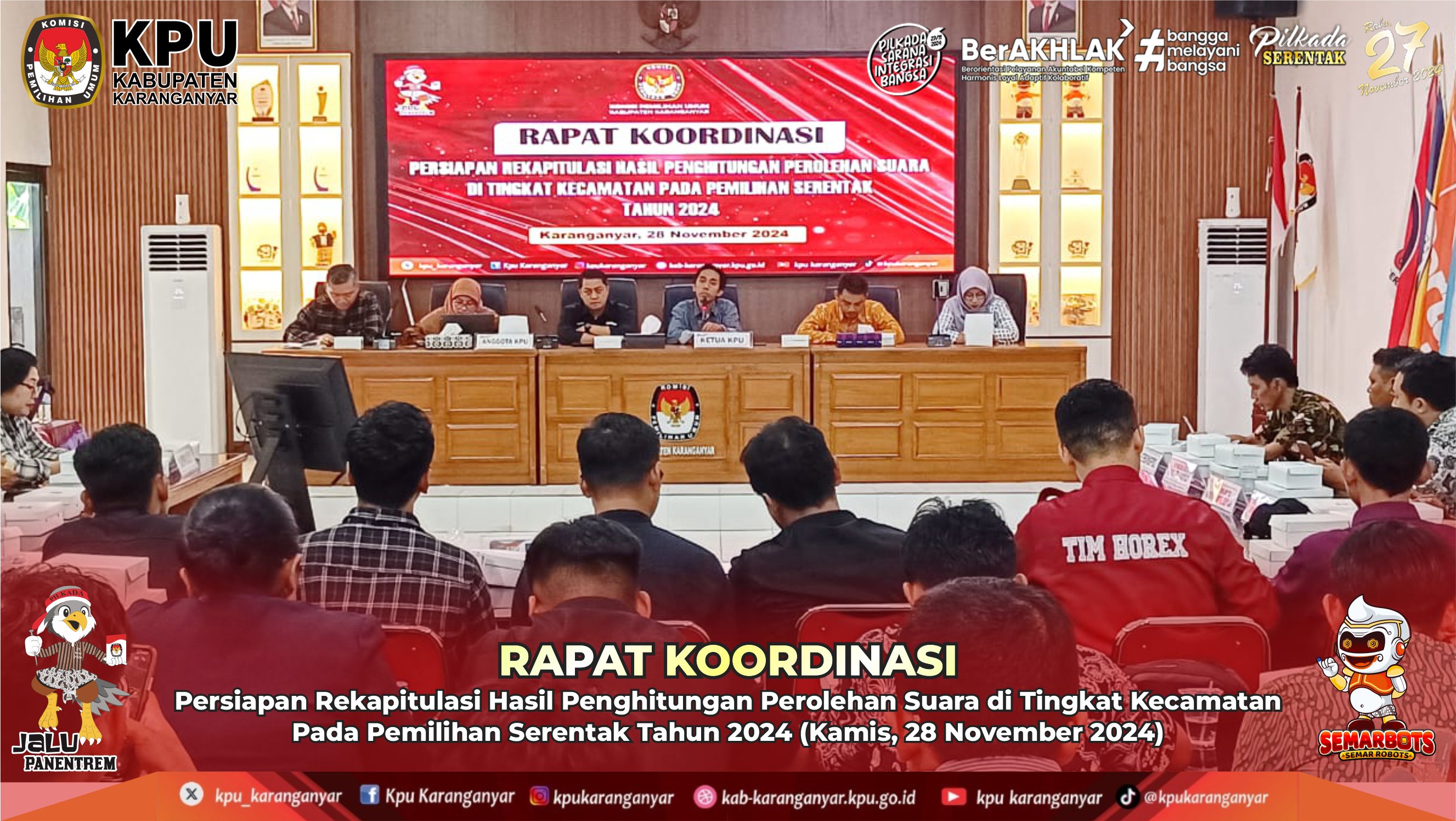 KPU Kabupaten Karanganyar Menggelar Rapat Koordinasi Persiapan Rekapitulasi Hasil Penghitungan Perolehan Suara di Tingkat Kecamatan Pada Pemilihan Serentak Tahun 2024 (Kamis, 28 November 2024)
